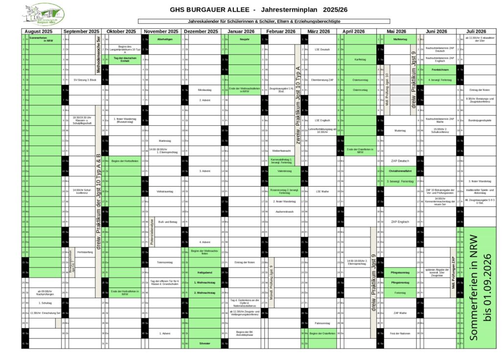Praktikum Jahrgangsstufe 10 Typ A und B: 02.09.2024 – 20.09.2024, Praktikum 10 Typ A: 17.02.2025 – 27.02.2025 – Langzeitpraktikum 10 Typ A ab dem 26.09.2025, jeweils donnerstags.